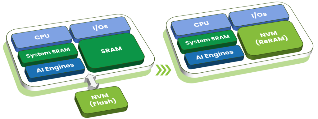 Today’s edge AI systems rely on a two-chip architecture, with external flash storing model weights and on-chip SRAM used as a temporary buffer to feed the AI engines. This approach increases power consumption, cost, and security risk while limiting the performance of such designs as data movement remains a challenge. These limitations are driving the industry to adopt new memory technologies such as ReRAM.